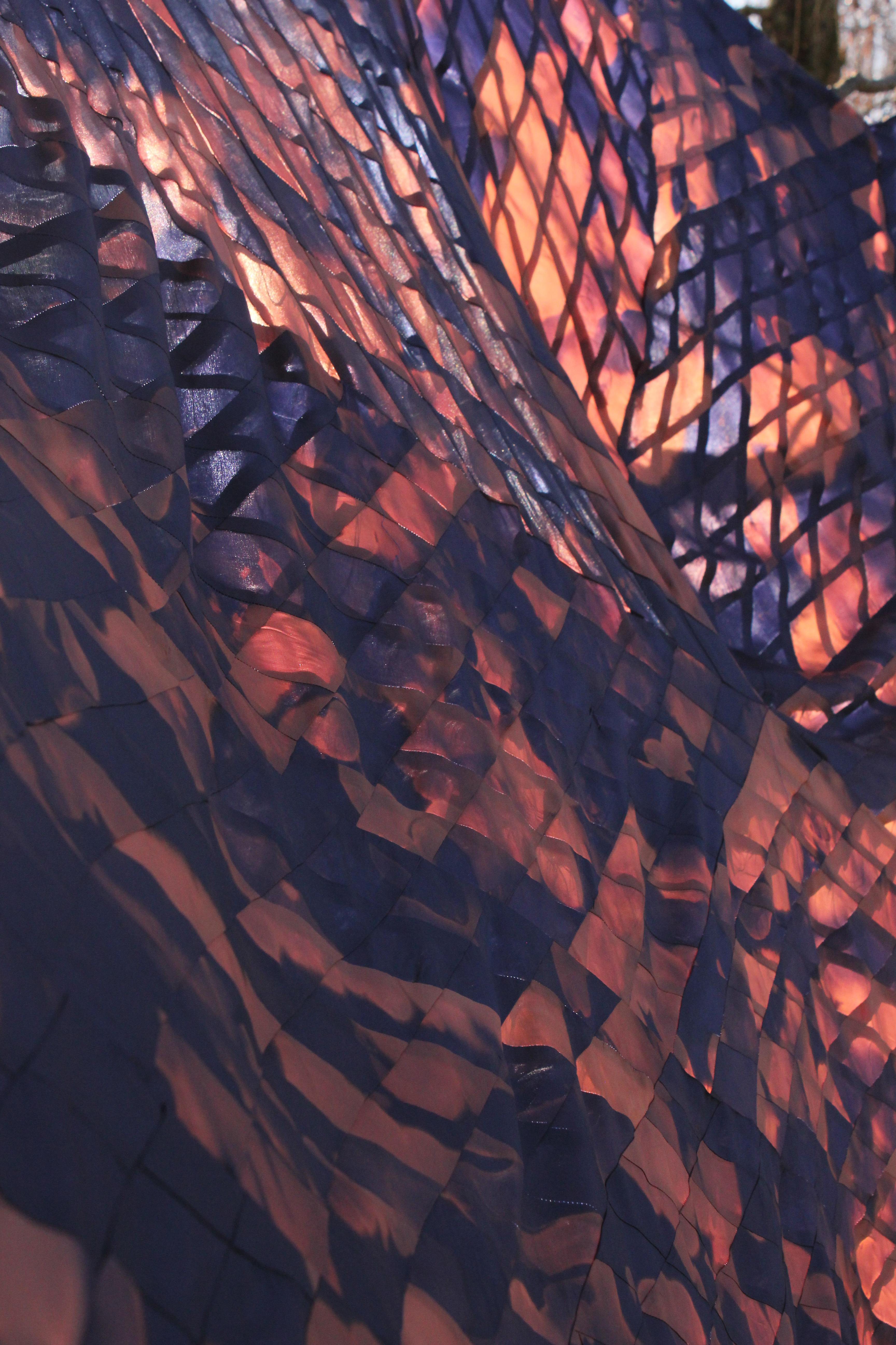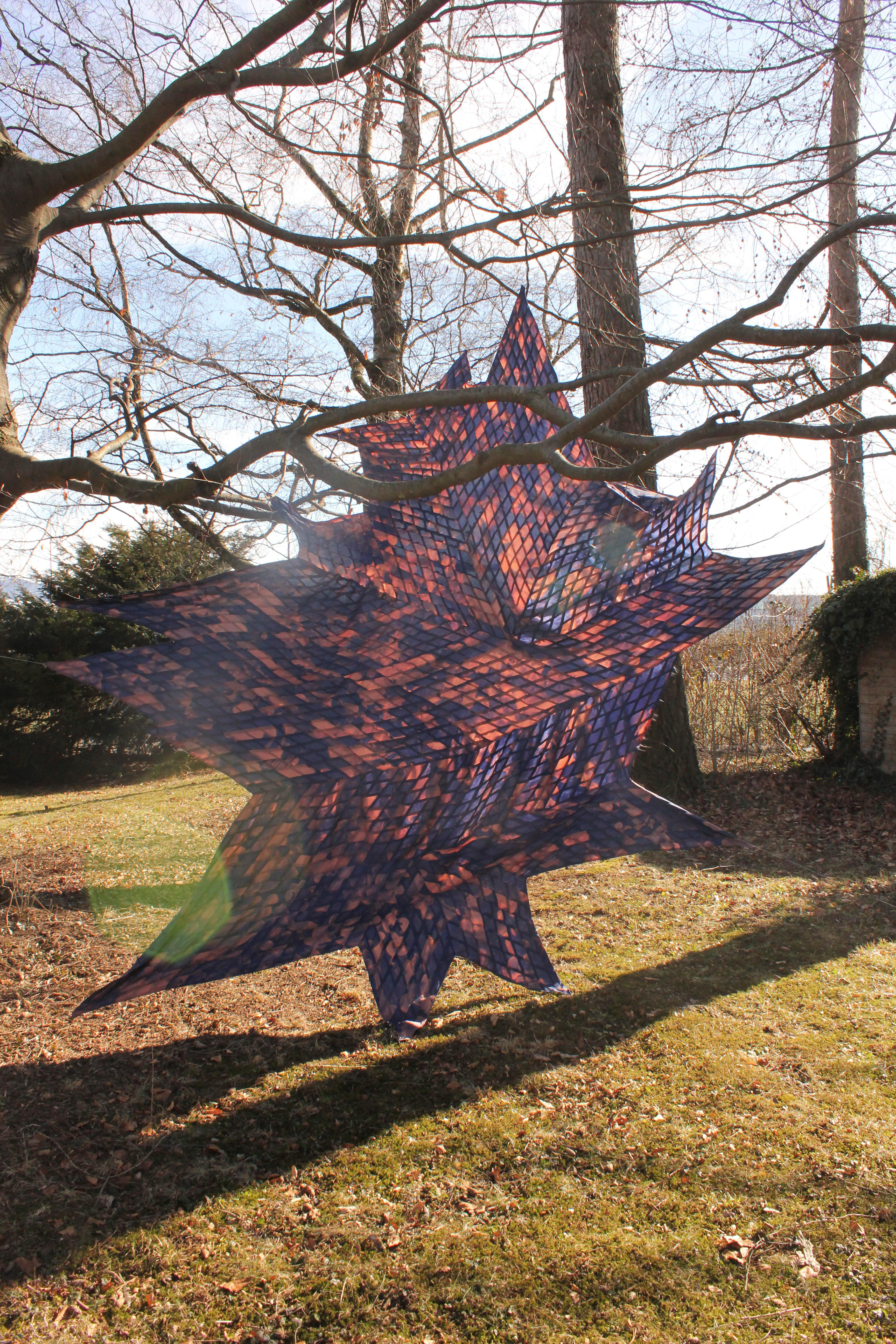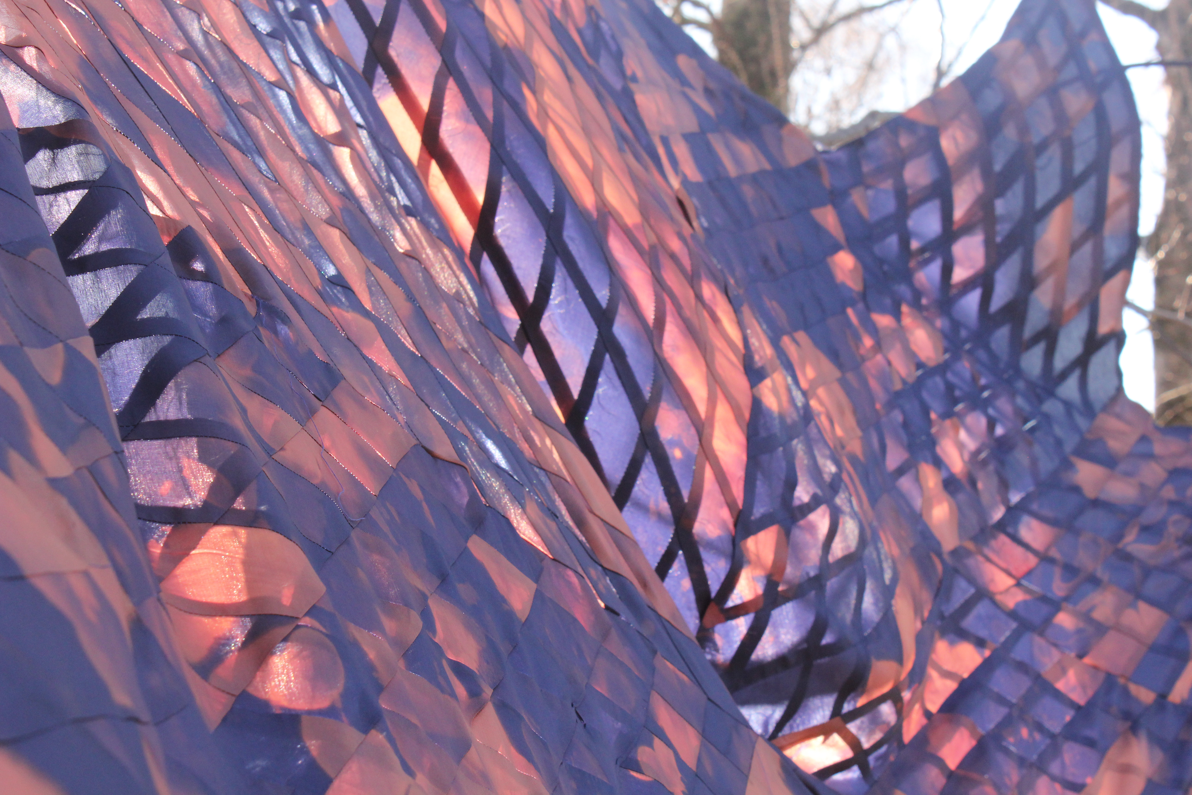 In meiner Auseinandersetzung habe ich mich als Einzelperson auf diese Technik eingelassen, jedoch die Idee einer Gemeinschaft eingearbeitet. Mit Pinseln- getaucht in Bleiche und Wasser - wurden auf langen Stoffbahnen Erinnerungen an Personen, Texte, Namen, Skizzen und Fragen eingeschrieben. Zerschnitten und neu zusammengenäht entstand daraus Broken Star, ein Erinnerungsort, der fragmentarisch bleibt, immer wieder bricht und sich in unserer Vorstellung neu zusammensetzt.